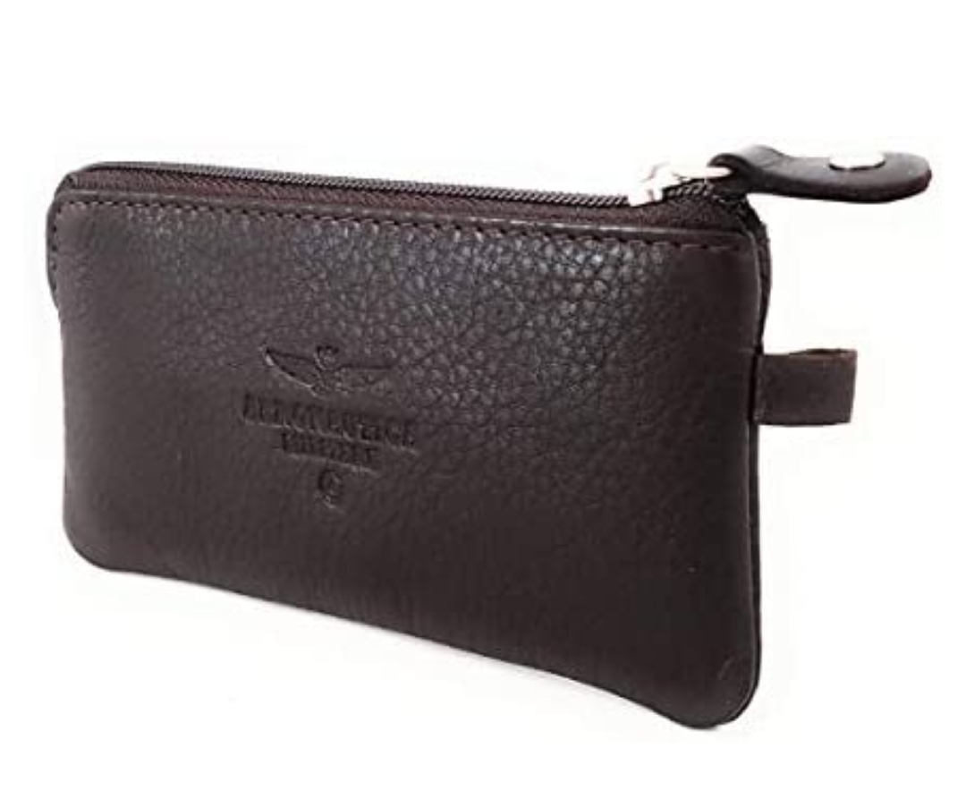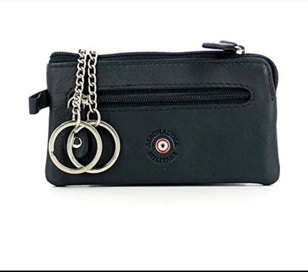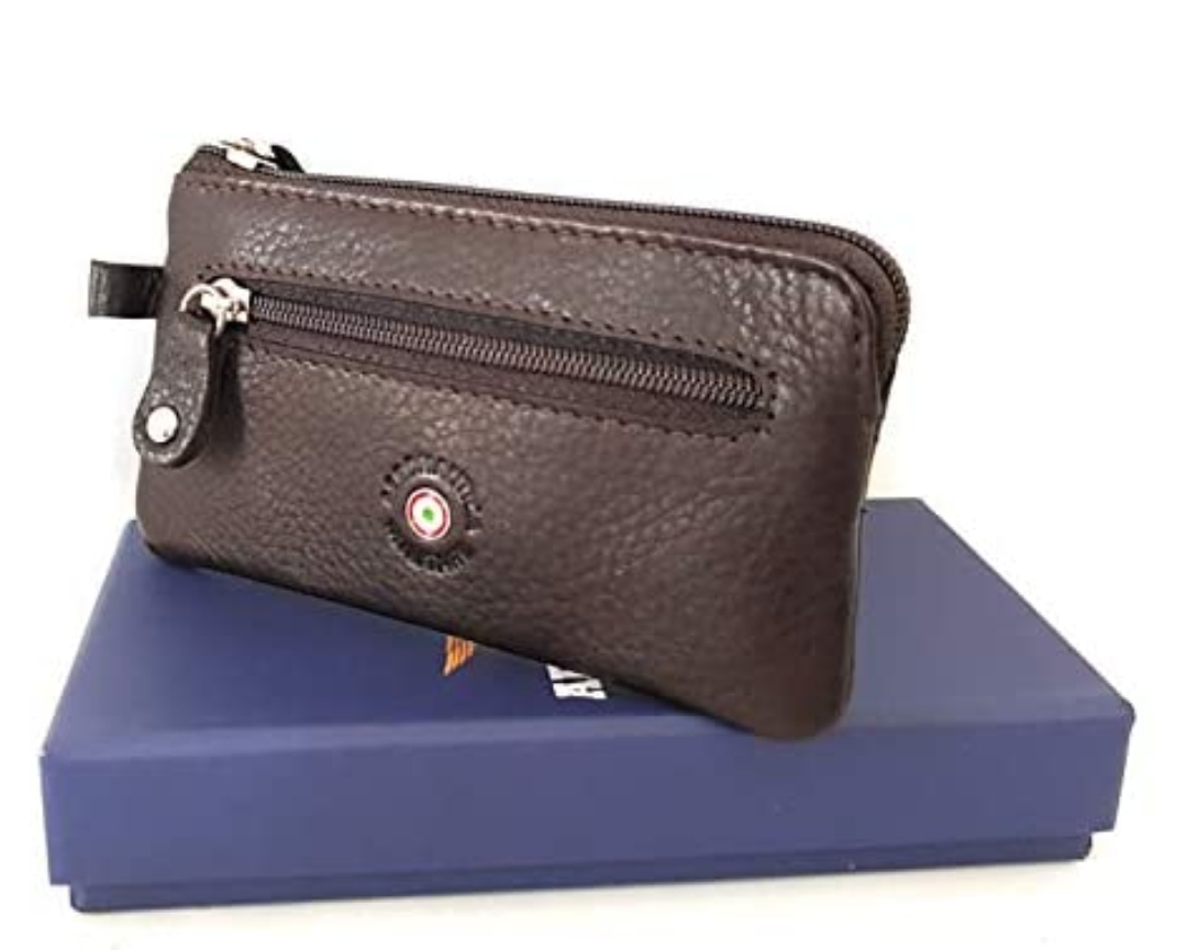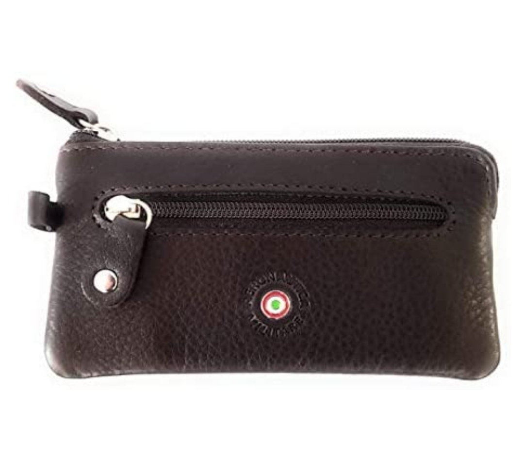 Portachiavi in pelle con logo stampato a fuoco e targhetta "coccarda" laccata con tricolore,dotato di un 2 anelli, chiusura a zip, tasca esterna.
