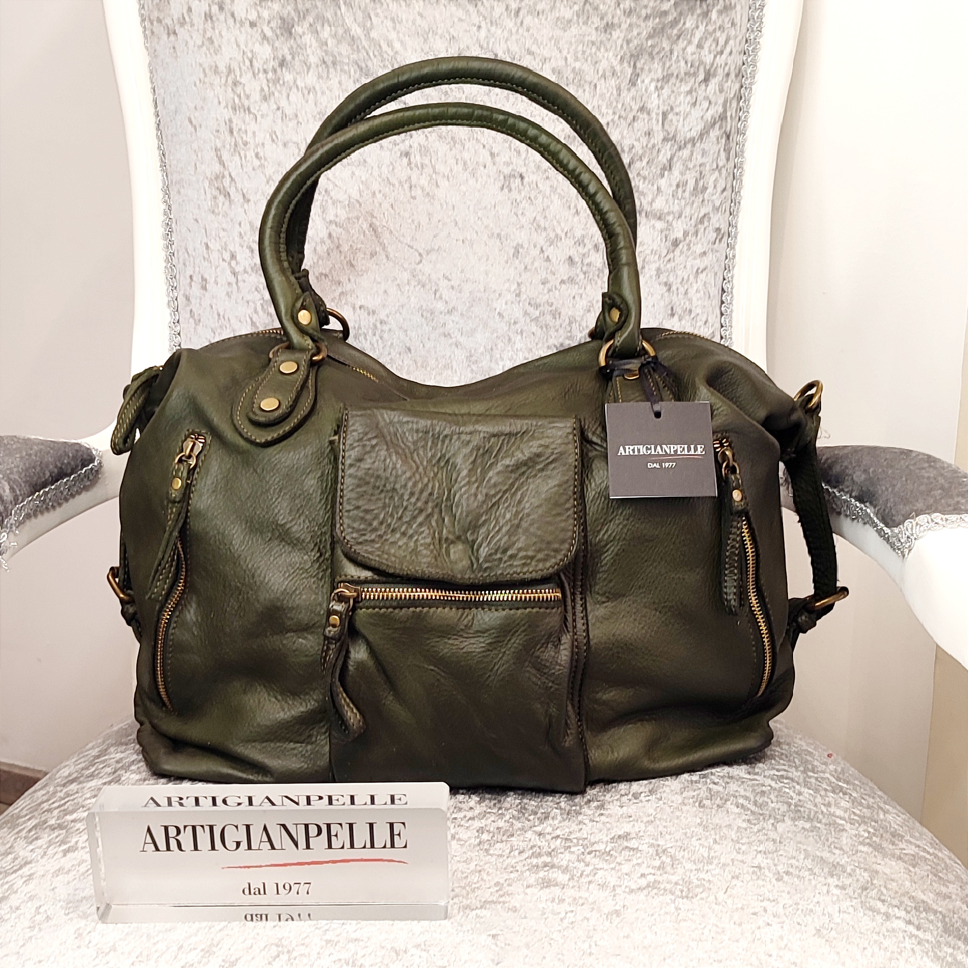 borsa   pelle   made   italy   artigianale   verde   spalla   manico   tracolla   regolabile   vera   morbida   grande   tasche   zip   interne   garantita   vintage