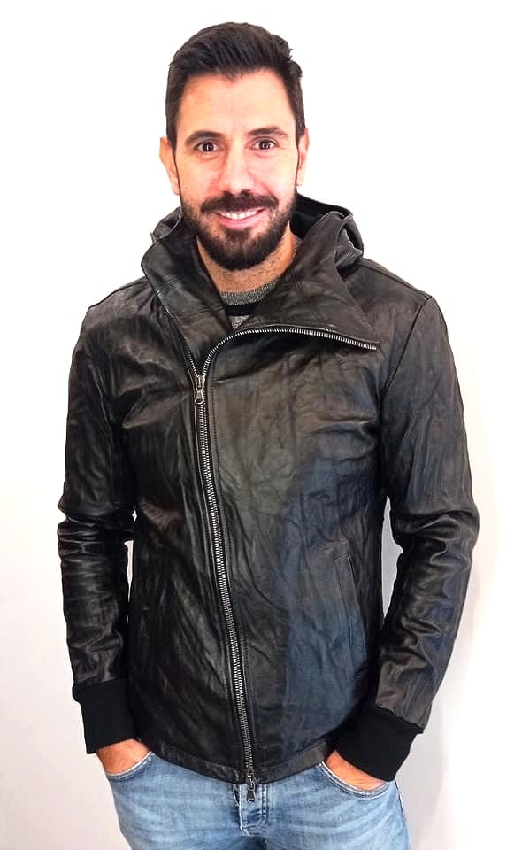 giacca   pelle   zip   trasversale   nero   lavato   stropicciato   cappuccio   aderente   stretto   vestibilita   slim   artigianale   concia   naturale   lavato   made   italy   imbottitura   leggera   nuovo   fashion   vera
