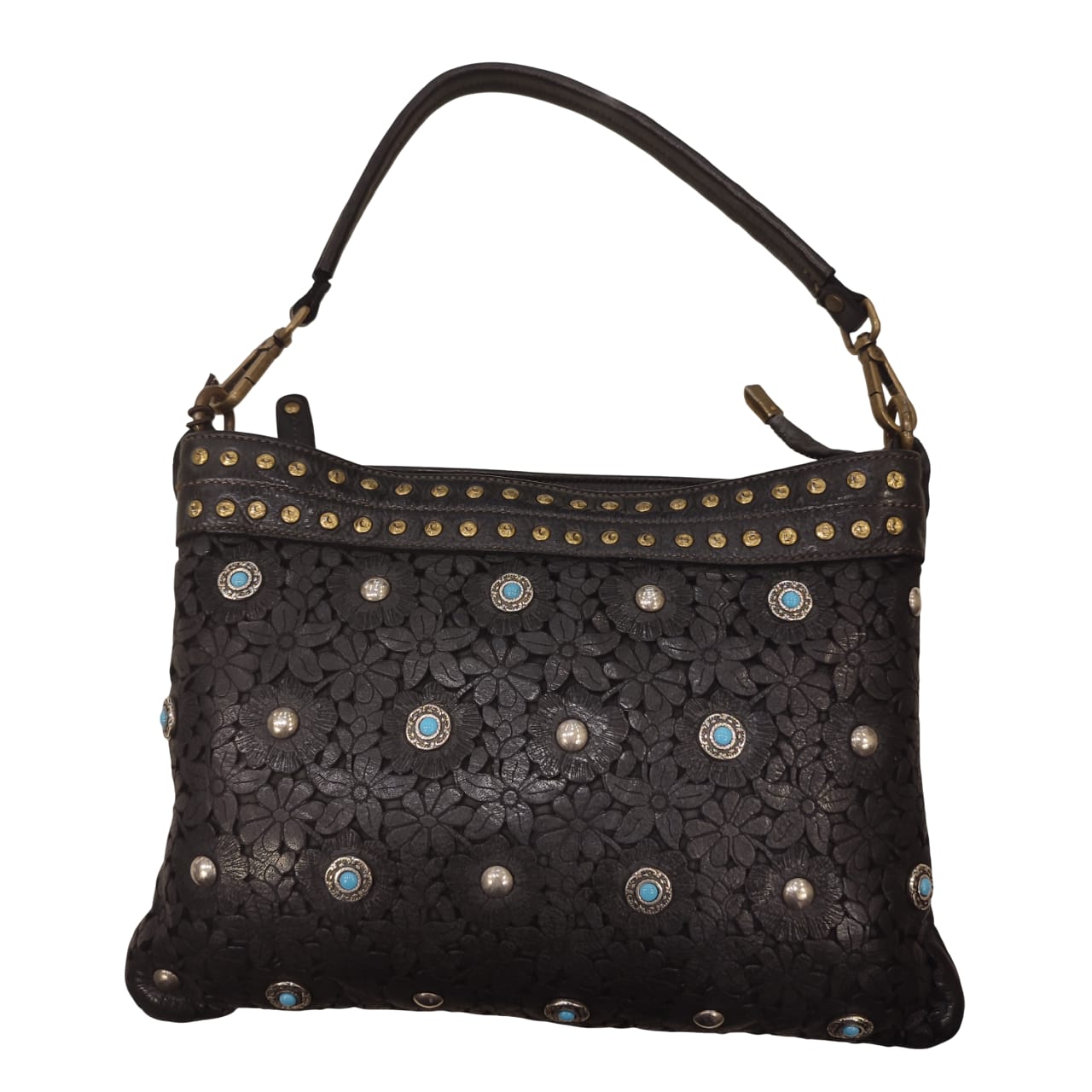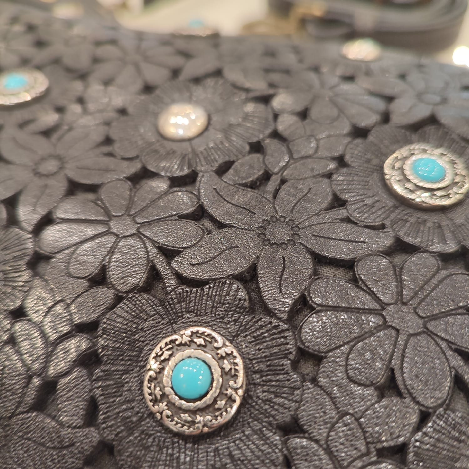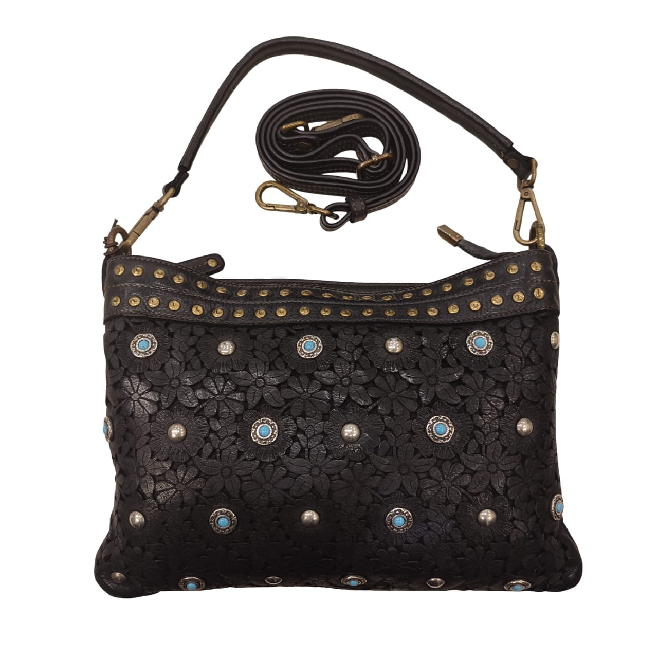 tracolla   regolabile   pelle   italy   nera   laserata   fiore   pietre   bulloni   celeste