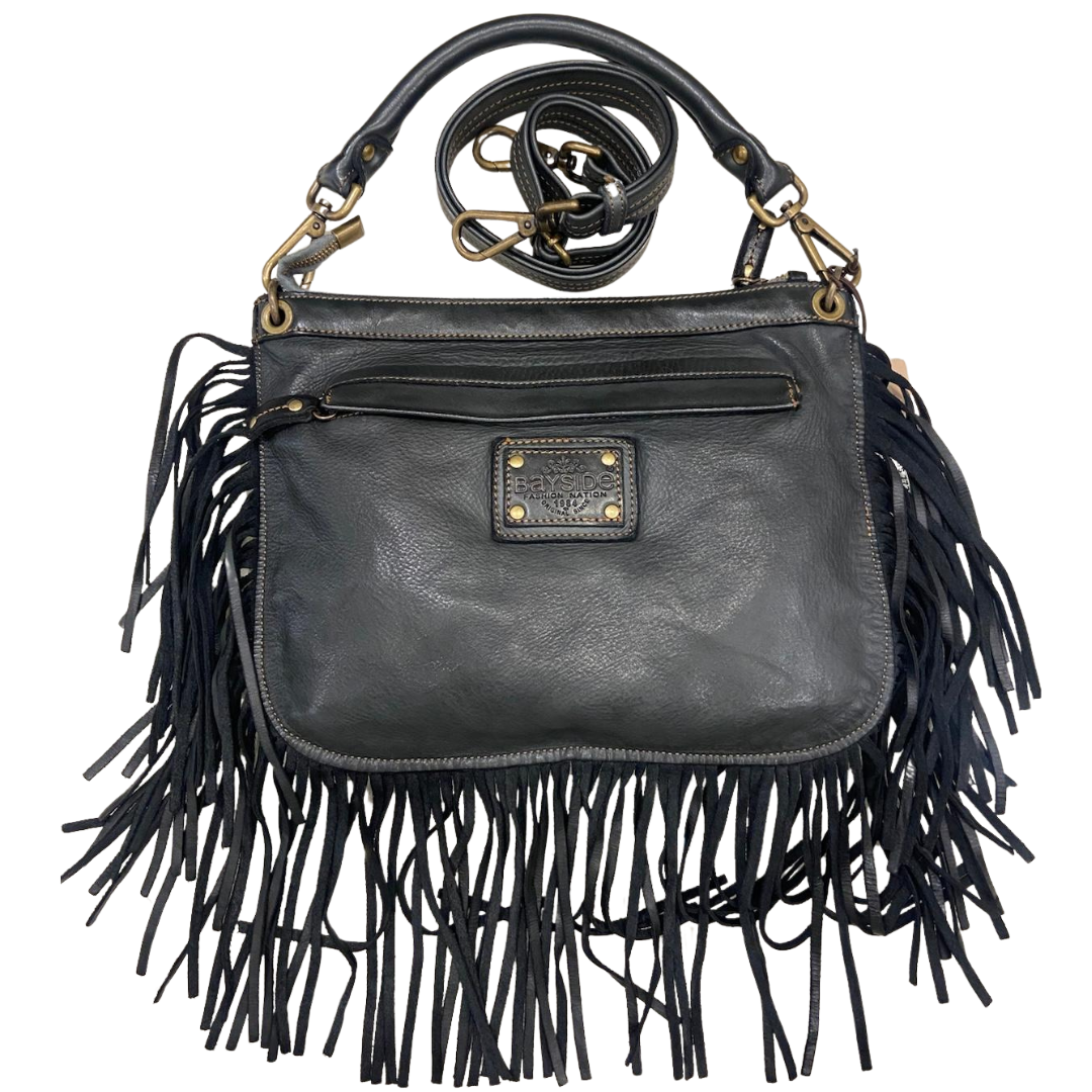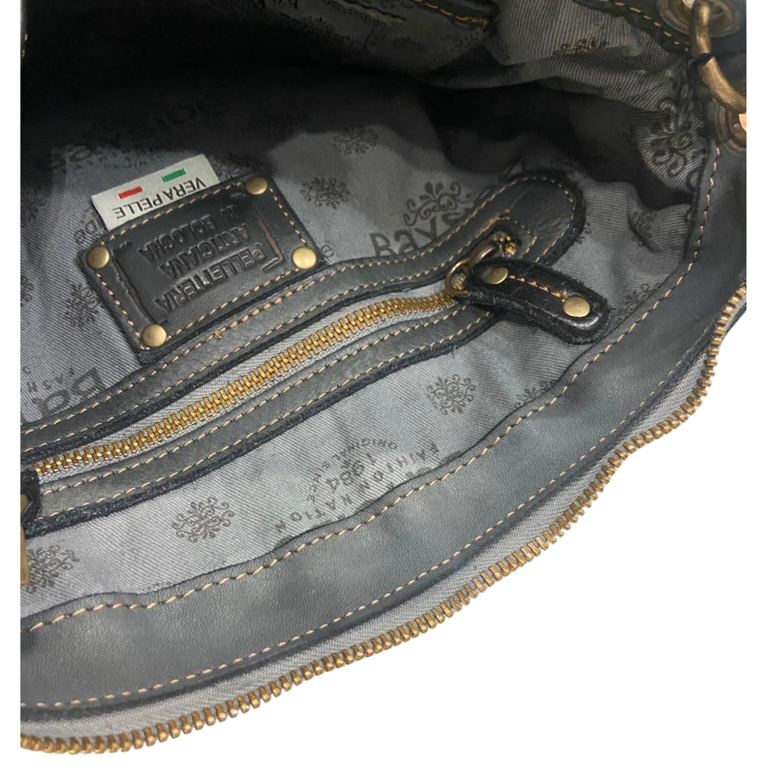 Descrizione Borsa Bayside Bs 772, è una borsa in cuoio di vitello con tintura in capo ed invecchiamento in bottale: un prodotto dal sapore autentico. Con questa lavorazione, ogni borsa diventa un oggetto unico ed inimitabile. Manico e spallacci regolabili in pelle, tasche interne foderate aperte e con zip, fodera in cotone rinforzato. Tasca posteriore antitaccheggio con chiusura lampo.La borsa e' dotata di frange. Stile vintage tipico degli borsa Bayside. Dimensione Larghezza 32, altezza 25 e profondità 6 cm Dettagli : La colorazione del prodotto è ottenuta attraverso un particolare procedimento di tintura dell'articolo. Questo processo rende la borsa con sfumature originali e differenti per ogni capo. Questa lavorazione potrebbe presentare delle "imperfezioni" dovute alla spazzolatura che non sono da considerarsi difetti, bensì risultati tipici di questo metodo che rendono ogni articolo unico ed esclusivo.
