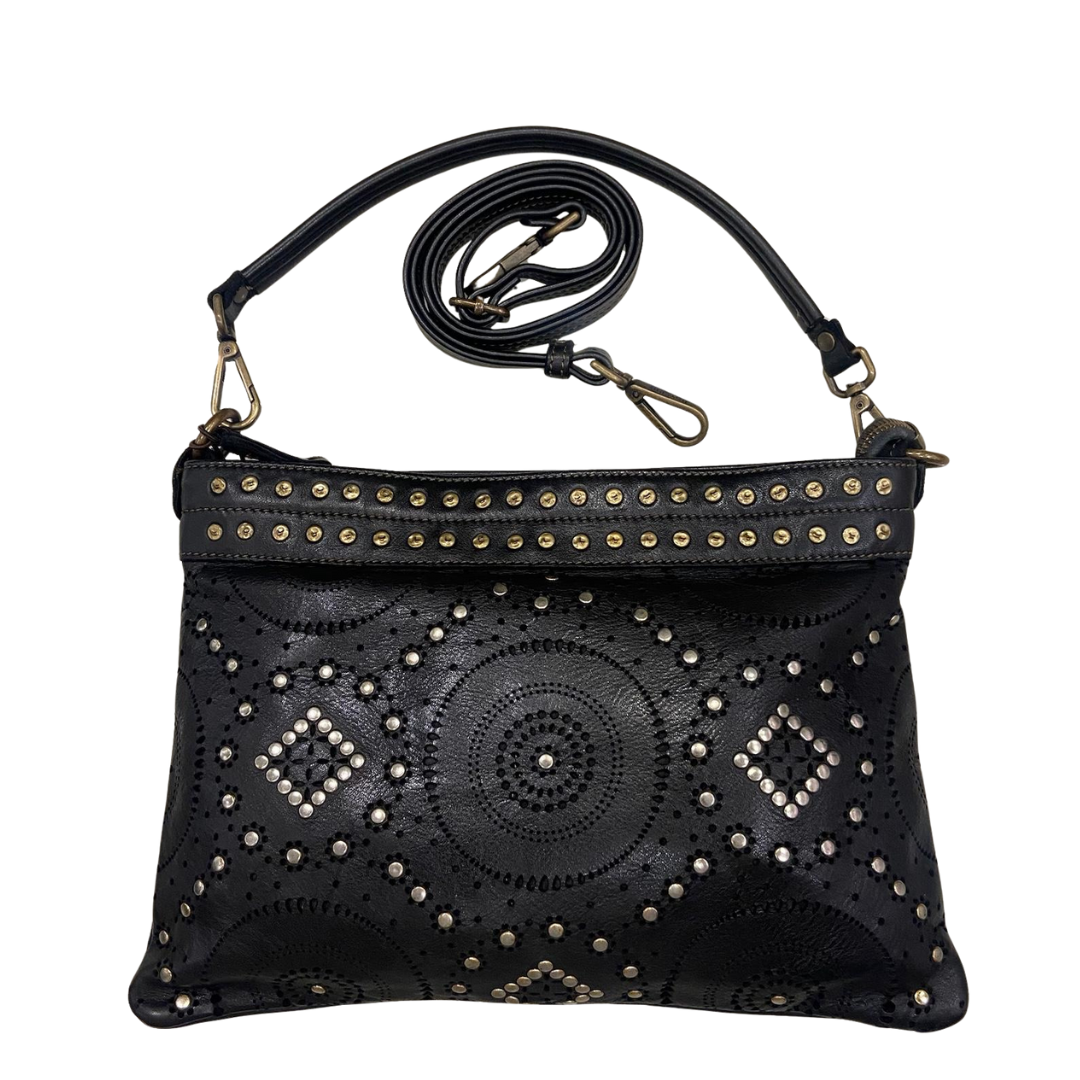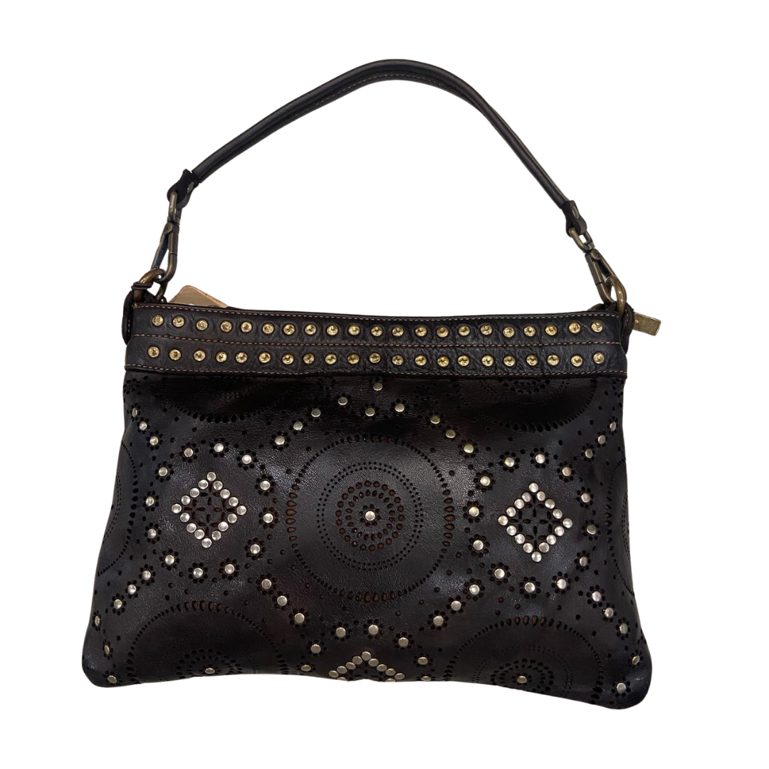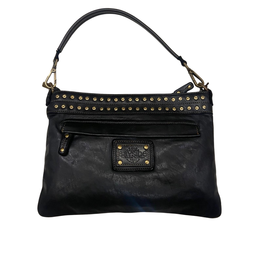 Descrizione Borsa Bayside Bs 758, è una borsa in cuoio di vitello con tintura in capo ed invecchiamento in bottale: un prodotto dal sapore autentico. Con questa lavorazione, ogni borsa diventa un oggetto unico ed inimitabile. Manico e spallacci regolabili in pelle, tasche interne foderate aperte e con zip, fodera in cotone rinforzato. Tasca posteriore antitaccheggio con chiusura lampo.La borsa e' dotata di disegno frontale al laser e borchie. Stile vintage tipico degli borsa Bayside. Dimensione Larghezza 32 , altezza 22 e profondità 6 cm Dettagli : La colorazione del prodotto è ottenuta attraverso un particolare procedimento di tintura dell'articolo. Questo processo rende la borsa con sfumature originali e differenti per ogni capo. Questa lavorazione potrebbe presentare delle "imperfezioni" dovute alla spazzolatura che non sono da considerarsi difetti, bensì risultati tipici di questo metodo che rendono ogni articolo unico ed esclusivo.