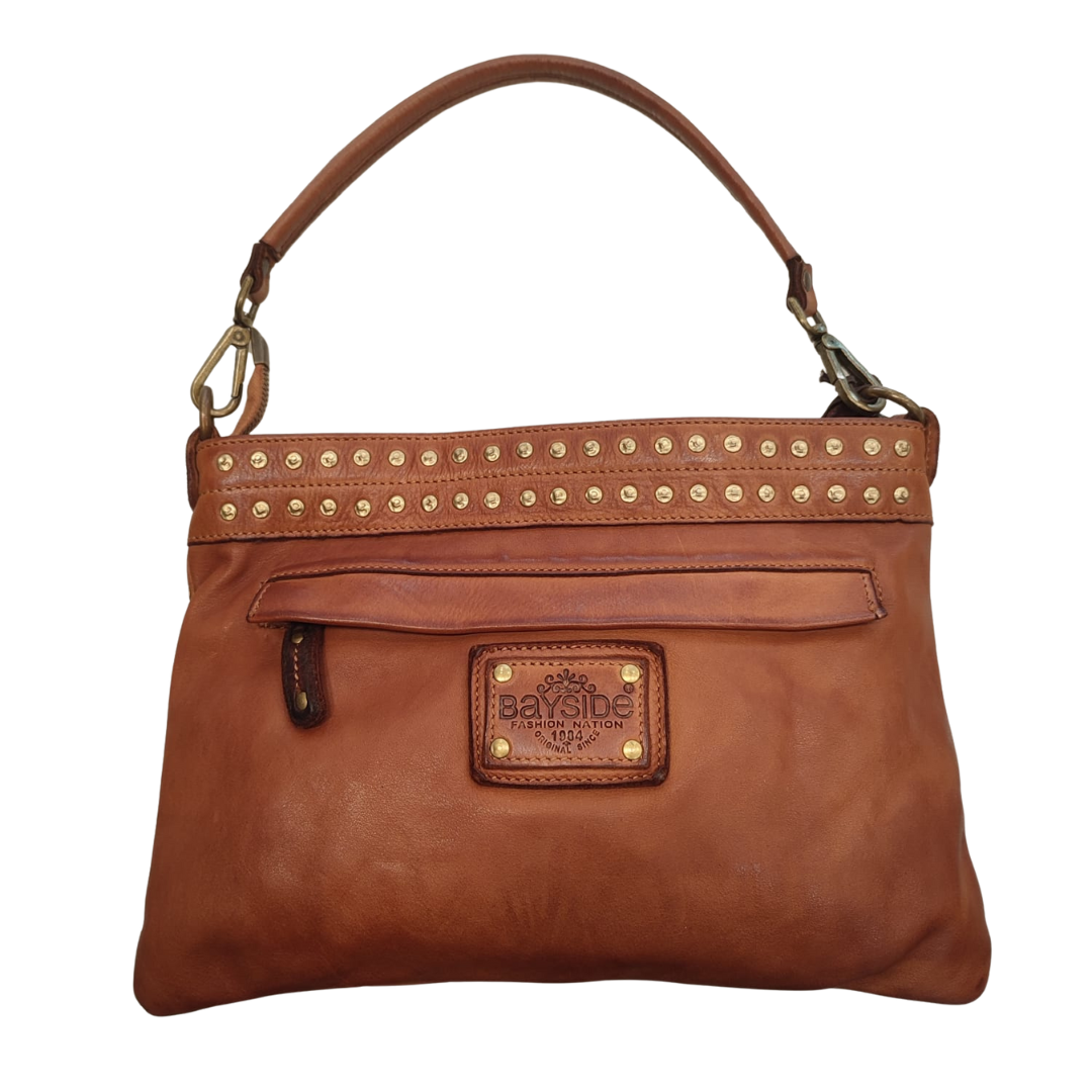 Descrizione Borsa Bayside Bs 758, è una borsa in cuoio di vitello con tintura in capo ed invecchiamento in bottale: un prodotto dal sapore autentico. Con questa lavorazione, ogni borsa diventa un oggetto unico ed inimitabile. Manico e spallacci regolabili in pelle, tasche interne foderate aperte e con zip, fodera in cotone rinforzato. Tasca posteriore antitaccheggio con chiusura lampo.La borsa e' dotata di disegno frontale al laser e borchie. Stile vintage tipico degli borsa Bayside. Dimensione Larghezza 32 , altezza 22 e profondità 6 cm Dettagli : La colorazione del prodotto è ottenuta attraverso un particolare procedimento di tintura dell'articolo. Questo processo rende la borsa con sfumature originali e differenti per ogni capo. Questa lavorazione potrebbe presentare delle "imperfezioni" dovute alla spazzolatura che non sono da considerarsi difetti, bensì risultati tipici di questo metodo che rendono ogni articolo unico ed esclusivo.
