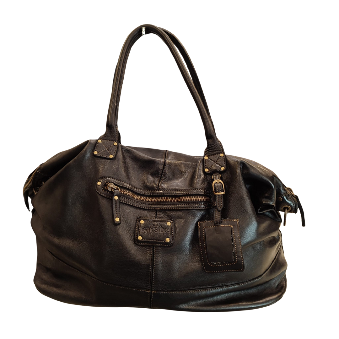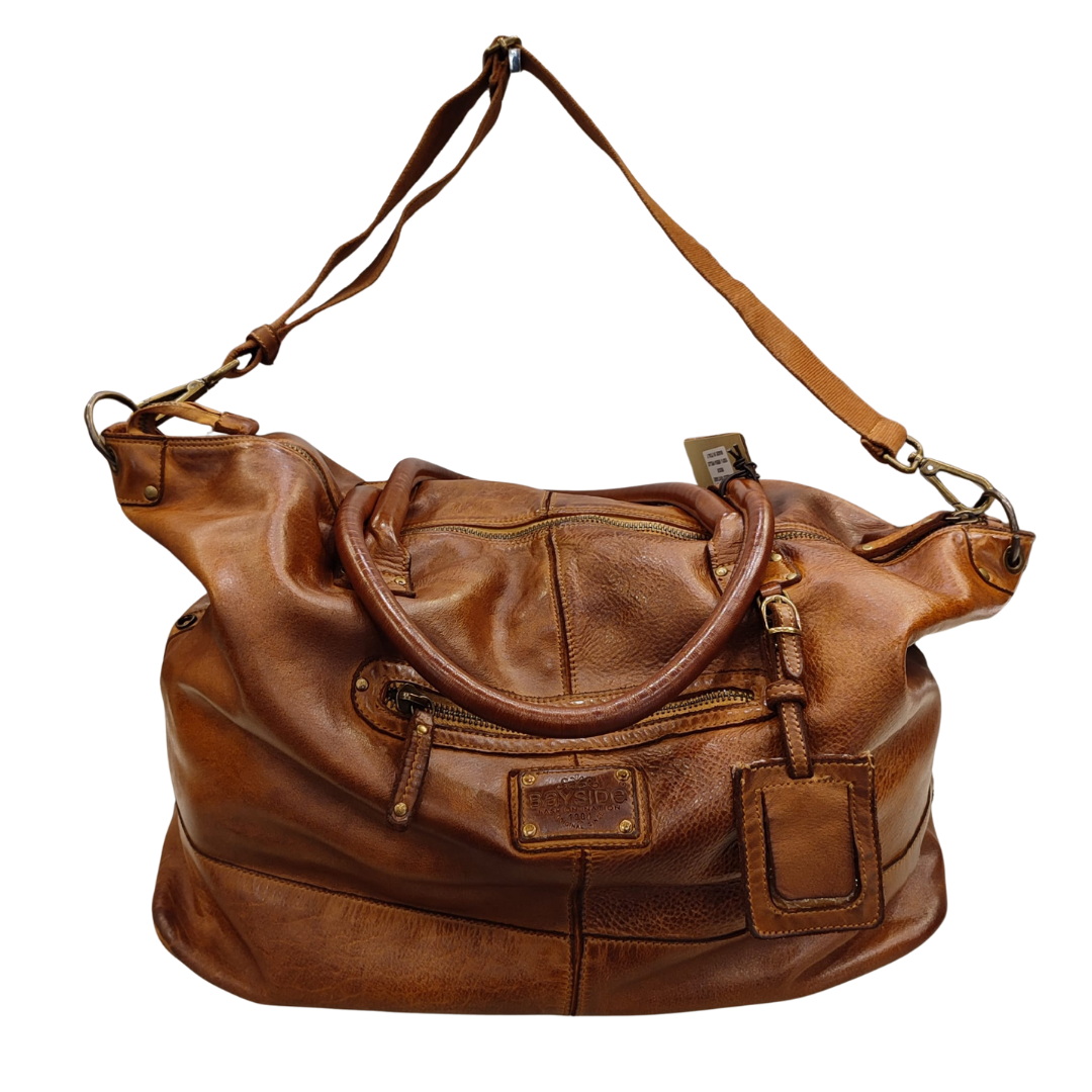 Descrizione Borsa Bayside Bs, è una borsa in cuoio di vitello con tintura in capo ed invecchiamento in bottale: un prodotto dal sapore autentico. Con questa lavorazione, ogni borsa diventa un oggetto unico ed inimitabile. Questo modello di borsa, per forme e dimensioni, è particolarmente adatto al Viaggio. Manico e spallacci regolabili in pelle, tasche interne foderate aperte e con zip, fodera in cotone rinforzato. Tasca posteriore antitaccheggio con chiusura lampo. Stile vintage tipico degli borsa Bayside. Dimensione Larghezza 50, altezza 25 e profondità 30 cm Dettagli La colorazione del prodotto è ottenuta attraverso un particolare procedimento di tintura dell'articolo. Questo processo rende la borsa con sfumature originali e differenti per ogni capo. Questa lavorazione potrebbe presentare delle "imperfezioni" dovute alla spazzolatura che non sono da considerarsi difetti, bensì risultati tipici di questo metodo che rendono ogni articolo unico ed esclusivo.
