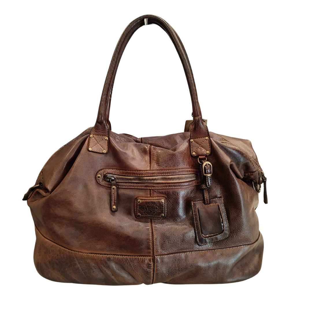Descrizione Borsa Bayside Bs, è una borsa in cuoio di vitello con tintura in capo ed invecchiamento in bottale: un prodotto dal sapore autentico. Con questa lavorazione, ogni borsa diventa un oggetto unico ed inimitabile. Questo modello di borsa, per forme e dimensioni, è particolarmente adatto al Viaggio. Manico e spallacci regolabili in pelle, tasche interne foderate aperte e con zip, fodera in cotone rinforzato. Tasca posteriore antitaccheggio con chiusura lampo. Stile vintage tipico degli borsa Bayside. Dimensione Larghezza 50, altezza 25 e profondità 30 cm Dettagli La colorazione del prodotto è ottenuta attraverso un particolare procedimento di tintura dell'articolo. Questo processo rende la borsa con sfumature originali e differenti per ogni capo. Questa lavorazione potrebbe presentare delle "imperfezioni" dovute alla spazzolatura che non sono da considerarsi difetti, bensì risultati tipici di questo metodo che rendono ogni articolo unico ed esclusivo.